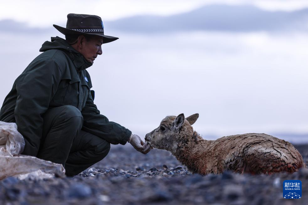 羌塘國家級自然保護區(qū)的野生動物專業(yè)管護隊員在安撫受傷的藏羚羊(6月13日攝)。新華社發(fā) 旦增 攝