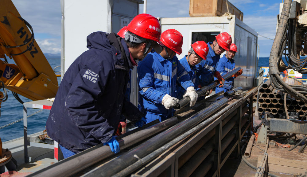 在海拔超過(guò)4700米的西藏納木錯(cuò)中心湖區(qū),21名來(lái)自五湖四海的鉆探專業(yè)技術(shù)人員,全天24小時(shí)輪班奮戰(zhàn)在面積僅200平方米的水上鉆探平臺(tái)上,協(xié)助第二次青藏科考科研人員提取湖泊巖芯樣品,這些樣本如同寶貝一樣,封存著青藏高原納木錯(cuò)地區(qū)百萬(wàn)年來(lái)的環(huán)境氣候變化信息。 擔(dān)任這次湖泊巖芯鉆探任務(wù)的是四川資源集團(tuán)華鋒鉆探隊(duì)。他們從5月31日入駐科考營(yíng)地、6月6日鉆取第一批湖泊巖芯樣品以來(lái)一直奮戰(zhàn)至今。這群平均年齡31歲的鉆探隊(duì)員常年工作在高海拔地區(qū),有著豐富的鉆探經(jīng)驗(yàn),此次鉆探是他們第一次進(jìn)行高海拔湖泊鉆探。目前納木錯(cuò)鉆探深度突破400米,達(dá)到國(guó)內(nèi)高海拔深水大湖的鉆探新紀(jì)錄。這些鉆探隊(duì)員在見證奇跡,也在創(chuàng)造歷史。