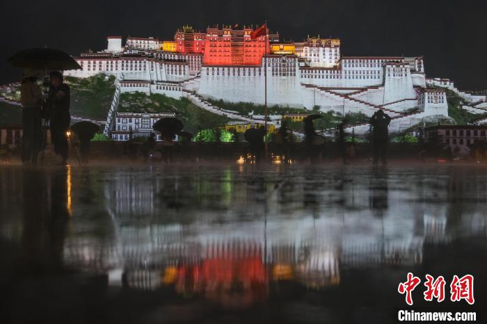 西藏布達(dá)拉宮是世界文化遺產(chǎn),入夏后,布達(dá)拉宮廣場(chǎng)音樂噴泉每晚準(zhǔn)時(shí)響起,景觀燈準(zhǔn)時(shí)照亮,宜人夜色吸引市民、游客前來(lái)觀景。圖為7月24日晚,拉薩迎來(lái)降雨,游客、攝影師等在廣場(chǎng)駐足,拍攝雨中的布達(dá)拉宮。中新社記者 江飛波 攝