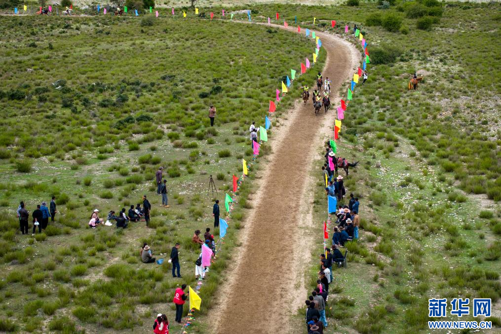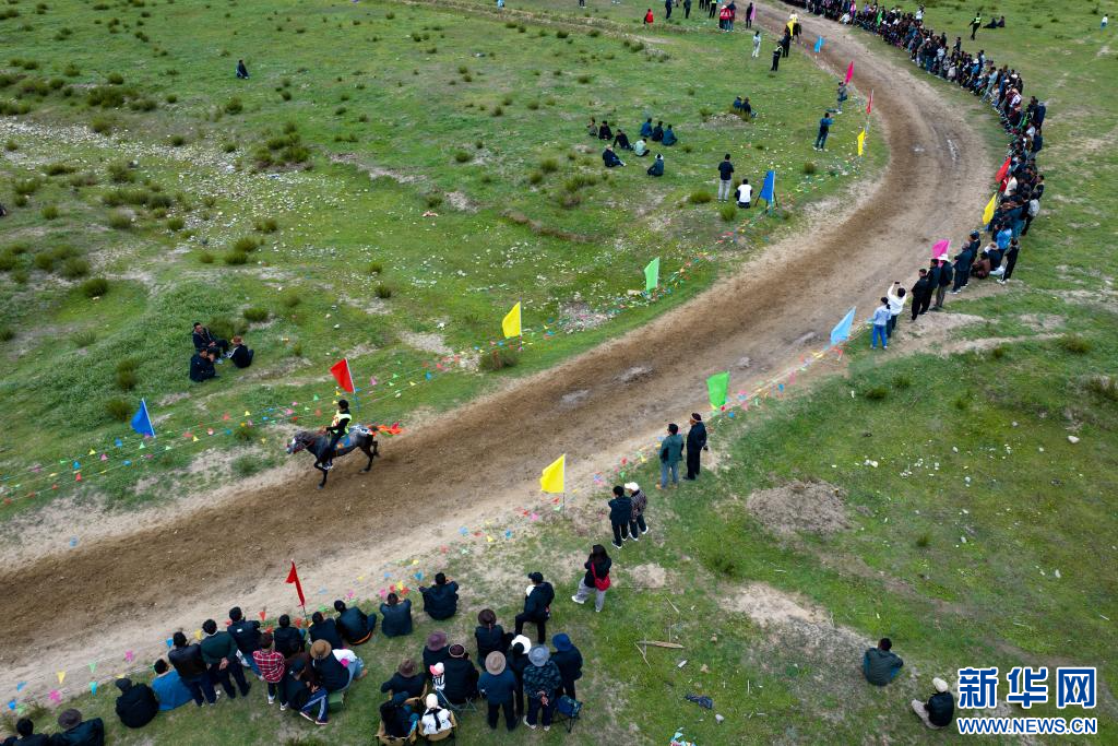 西藏林芝市林芝鎮(zhèn)第七屆尼洋旅游文化之民俗賽馬藝術(shù)節(jié)活動(dòng)現(xiàn)場(chǎng)(7月22日攝,無人機(jī)照片)。新華網(wǎng) 旦增努布 攝