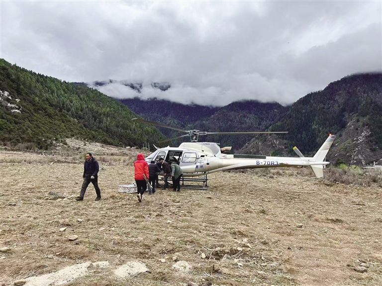直升機(jī)裝載相關(guān)設(shè)備,準(zhǔn)備起飛監(jiān)控堰塞湖情況。