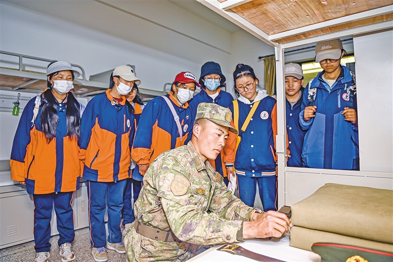 圖為八一建軍節(jié)前夕,西藏日喀則軍分區(qū)聯(lián)合日喀則市委宣傳部開展“強(qiáng)國(guó)復(fù)興有我”系列軍旅活動(dòng),組織青少年學(xué)生零距離感受軍營(yíng)風(fēng)采,切實(shí)提高國(guó)防意識(shí),激發(fā)愛國(guó)主義情懷。這是學(xué)生們參觀官兵宿舍。通訊員 馮千恩 劉煜欽 記者 楊子彥 攝