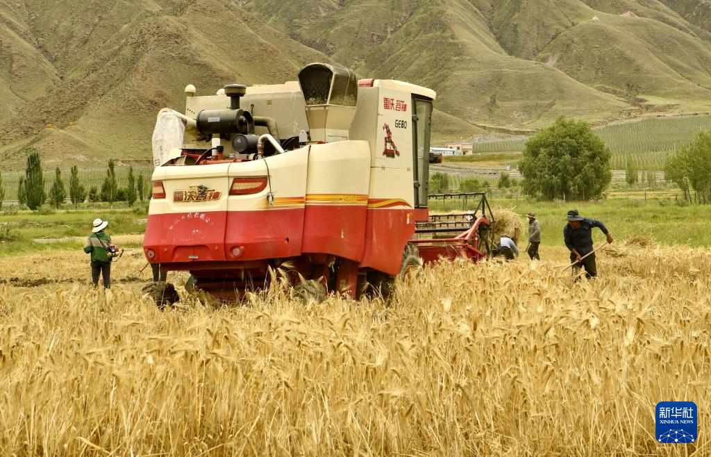 7月31日,聯(lián)合收割機在山南市扎囊縣扎其鄉(xiāng)朗賽嶺村的農田里收割青稞。新華社記者 張汝鋒 攝