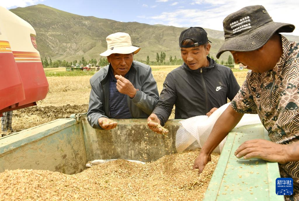 7月31日,山南市扎囊縣扎其鄉(xiāng)朗賽嶺村村民檢查青稞品質。新華社記者 張汝鋒 攝
