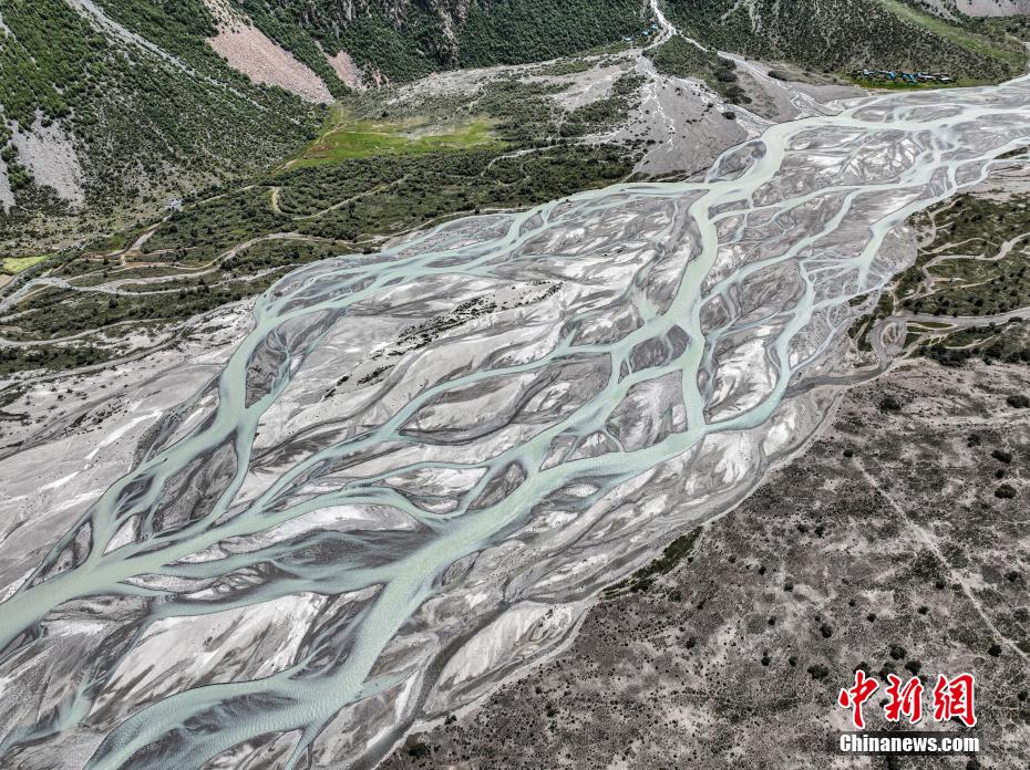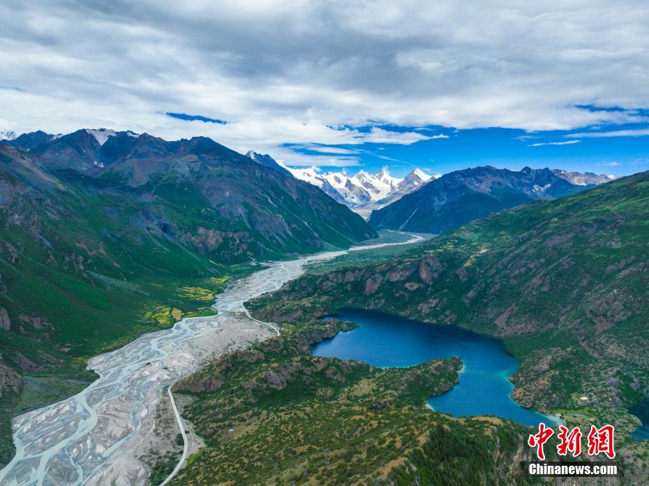 圖為三色湖旁邊的冰雪融化的河流。(無(wú)人機(jī)照片)中新社記者 貢嘎來(lái)松 攝