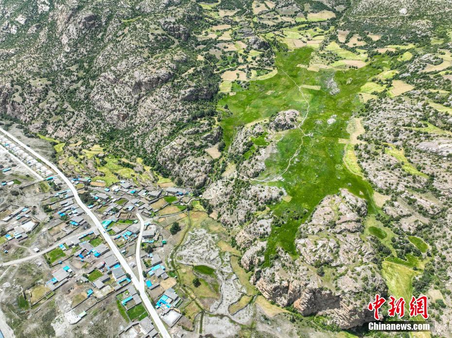 圖為三色湖旁邊的普玉村。(無(wú)人機(jī)照片)中新社記者 貢嘎來(lái)松 攝