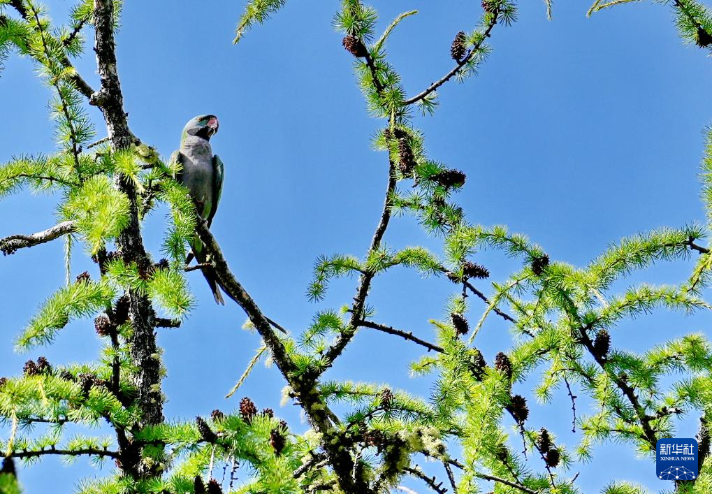 棲息在巴松措旅游風(fēng)景區(qū)內(nèi)的大紫胸鸚鵡(8月2日攝)。新華社記者 張汝鋒 攝