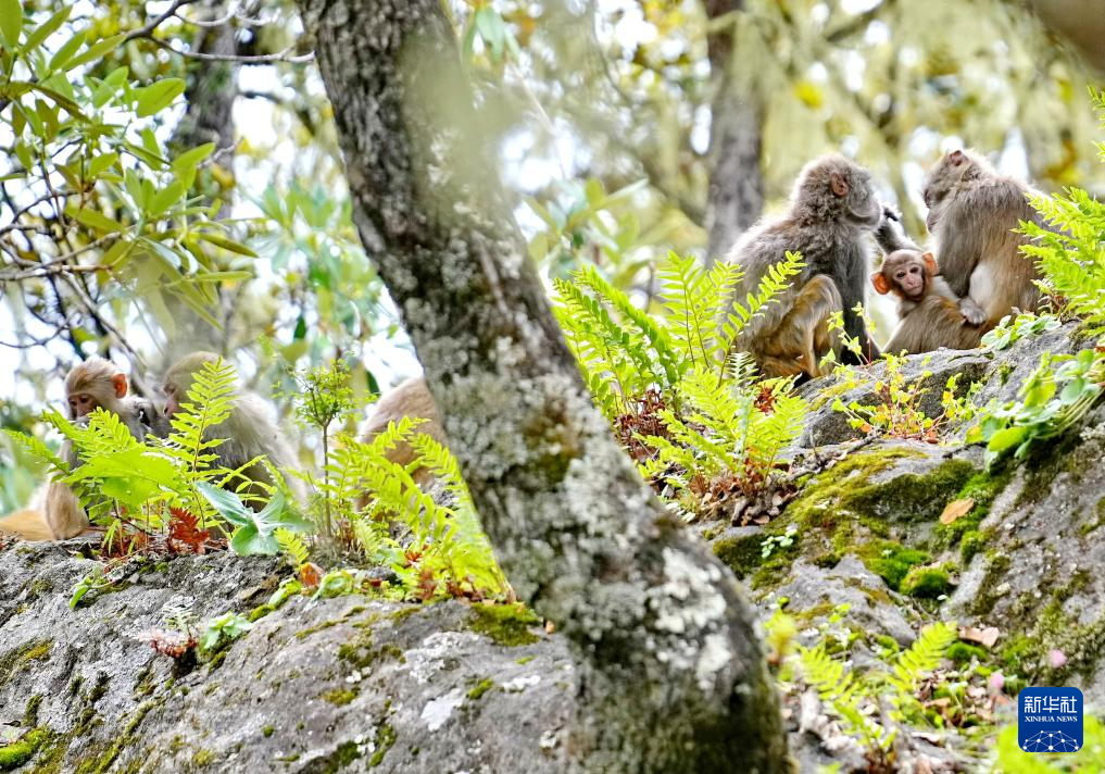 巴松措旅游風(fēng)景區(qū)里嬉戲的藏獼猴(8月2日攝)。新華社記者 張汝鋒 攝