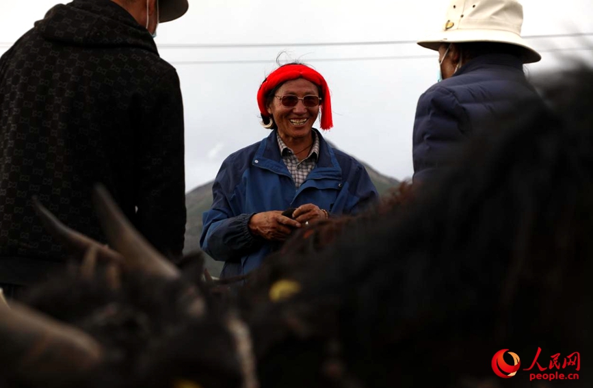 圖為當雄縣郭慶村排隊領取牦牛的村民。人民網(wǎng)記者 次仁羅布攝