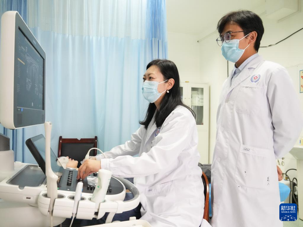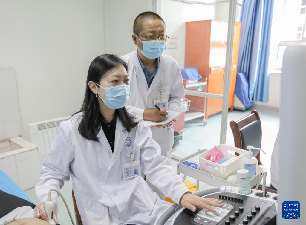 在西藏自治區(qū)人民醫(yī)院,徐鐘慧(左)與徒弟宋彬彬在為患者進(jìn)行超聲檢查(7月12日攝)。新華社記者 丁汀 攝
