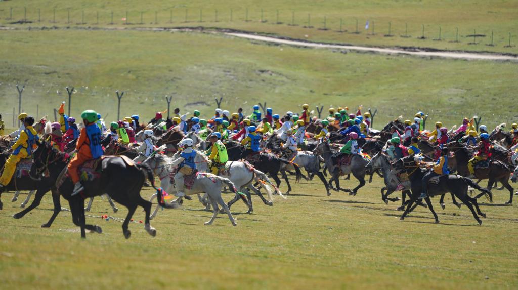 12日,10公里傳統(tǒng)大跑項(xiàng)目開(kāi)賽,上百匹駿馬在草原上揚(yáng)蹄疾奔,騎手多是十來(lái)歲的少年。15歲的普扎巴從6歲開(kāi)始做騎手,曾騎著當(dāng)?shù)卦S多名馬到各地參加比賽,拿過(guò)多次冠軍?!拔蚁嘈胚@次也能拿第一名?!?0日,他在馬背上對(duì)記者說(shuō)。