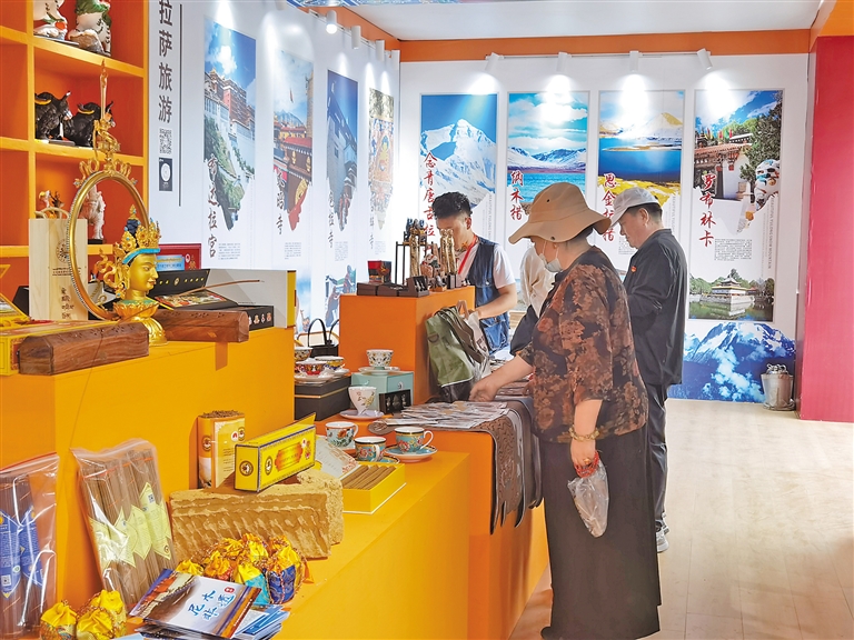 第二屆西藏文化藝術節(jié)期間,游客在參觀非遺文創(chuàng)產(chǎn)品。記者 鄭璐 袁海霞 攝
