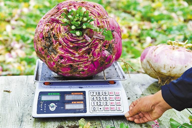 圖為8月14日,拉薩市曲水縣才納鄉(xiāng)收獲10.01公斤重蕪菁?jí)K根。新華社記者 張汝鋒 攝