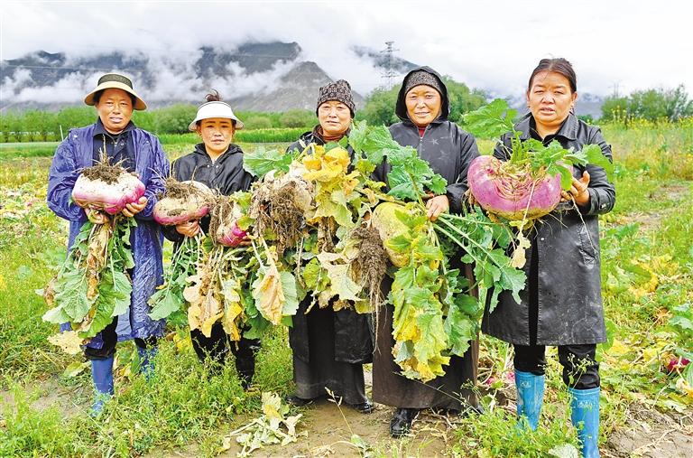圖為8月14日,在田間抱著蕪菁新品種的拉薩市曲水縣才納鄉(xiāng)才納村村民。新華社發(fā)(盧丹陽 攝)