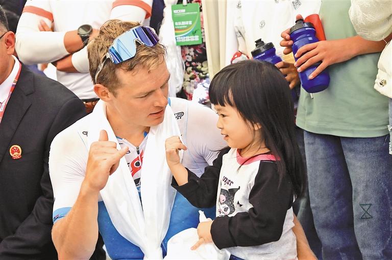 第一賽段第一名、來(lái)自飛銳蒙古洲際隊(duì)的LAAS Martin和當(dāng)?shù)睾⒆踊?dòng)。記者 洛桑平措 謝筱純 王珊 攝