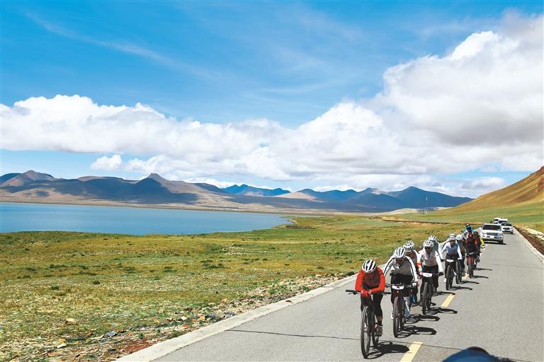 圖為參賽選手騎行在普莫雍措湖畔。本報(bào)記者 潘璐 攝