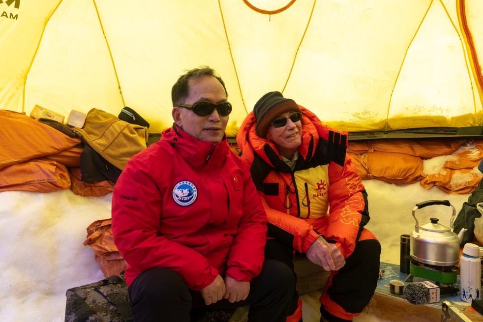 姚檀棟(左)、湯普森在普若崗日冰原10號(hào)冰川冰穹C作業(yè)點(diǎn)工作帳篷內(nèi)查看作業(yè)情況時(shí)合影。新華社記者姜帆 攝