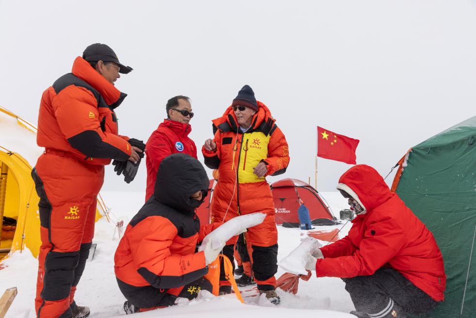 姚檀棟(左一)、湯普森(左二)在普若崗日冰原10號(hào)冰川冰穹C作業(yè)點(diǎn)工作帳篷內(nèi)與冰芯鉆取工作負(fù)責(zé)人徐柏青研究員合影。新華社記者姜帆 攝