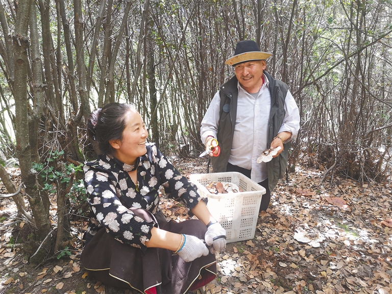 圖為林芝市工布江達(dá)縣甲熱村村民在林下采摘靈芝。記者 周輝 攝