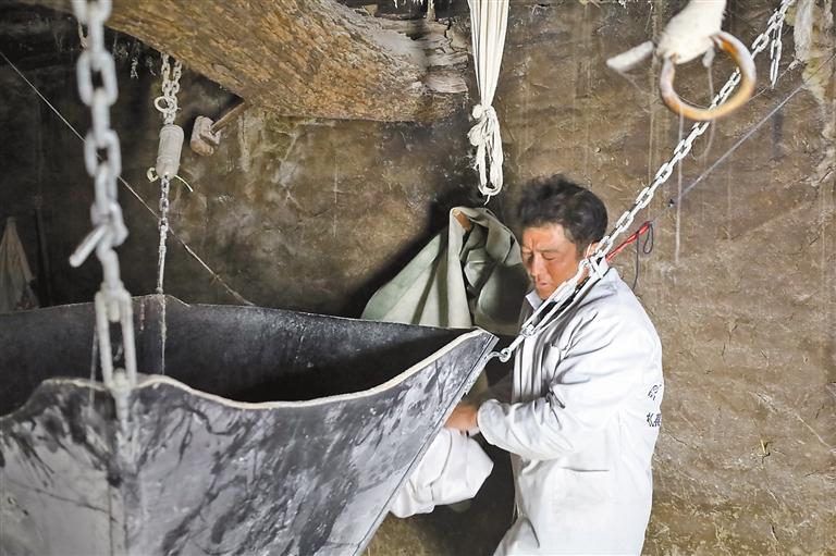 村民往水磨坊里倒入青稞。記者 頓珠扎西 攝