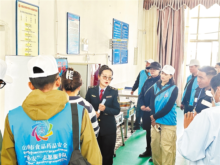 山南市市場監(jiān)管執(zhí)法人員向食品藥品安全志愿服務(wù)隊講解食品安全檢查相關(guān)內(nèi)容。記者 巴桑旺姆 攝