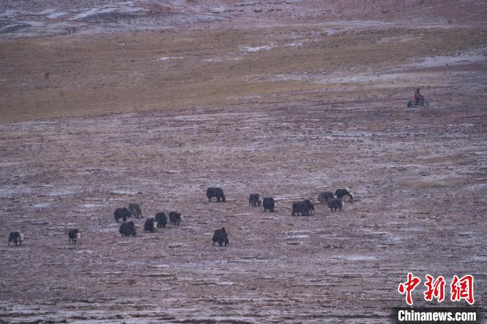 10月23日,西藏自治區(qū)那曲市安多縣多瑪鄉(xiāng)牧民在雪中放牧。當(dāng)日,一場(chǎng)雪將藏北草原裝扮得如詩(shī)如畫(huà)。牧民們?cè)谶@銀裝素裹的天地間,開(kāi)始了雪中放牧的生活。牛羊在雪地中悠閑覓食,牧民駕駛著摩托車(chē),在雪中放牧,形成了一幅動(dòng)人的風(fēng)景畫(huà)。圖為牦牛在草原上覓食。中新社記者 貢嘎來(lái)松 攝