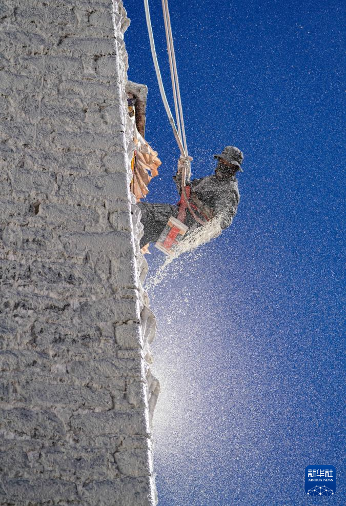10月28日,布達(dá)拉宮管理處的工作人員在噴灑涂料。新華社記者 旦增尼瑪曲珠 攝