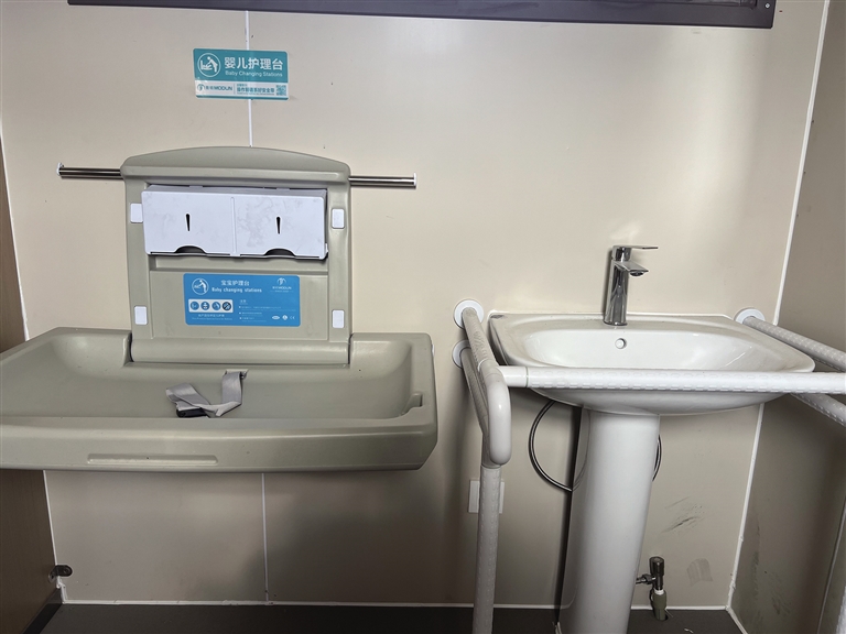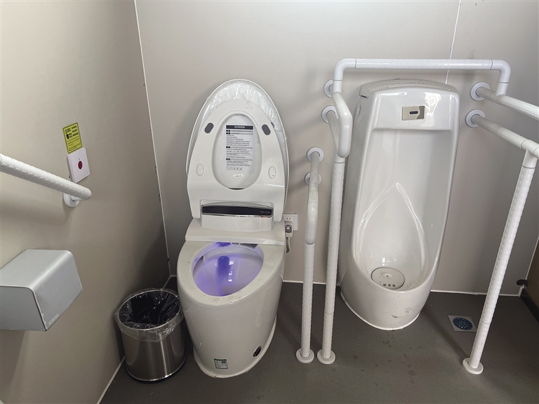 公廁內(nèi)部除了正常的蹲位,還設(shè)有第三衛(wèi)生間。第三衛(wèi)生間內(nèi)配有嬰兒護理臺、嬰兒安全座椅等設(shè)施。除此之外,第三衛(wèi)生間還設(shè)有安全扶手、智能馬桶等設(shè)備,方便腿腳不方便的老年人及殘疾人。智能馬桶旁還安裝有緊急報警器?!叭绻欣先嗽趲?,就可以按一下緊急報警器。這也是我們考慮到殘疾人、老年人如廁不方便,增設(shè)的人性化設(shè)計。”赤列說。