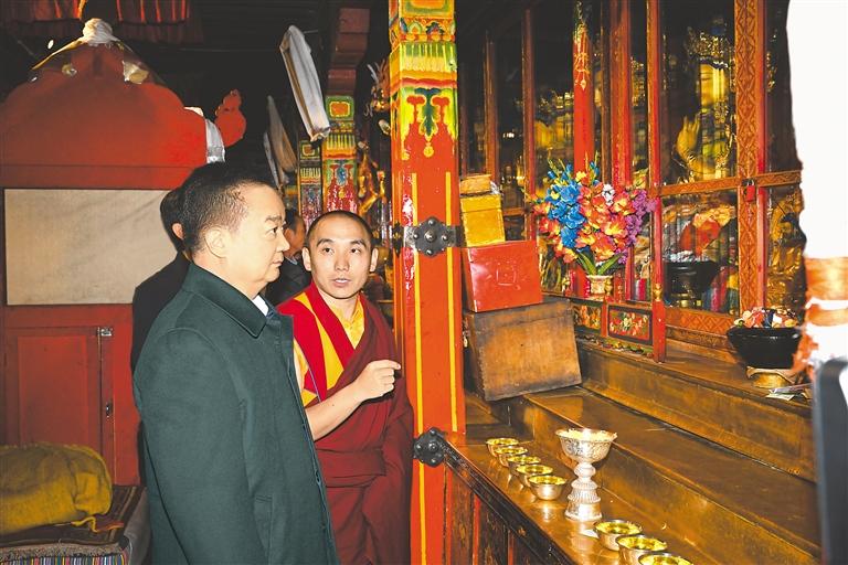 王君正深入寺廟開展調(diào)研,與僧尼親切交流。扎西吉培寺坐落于謝通門縣,歷史悠久、氣勢恢宏。王君正來到這里,詳細了解該寺加強和創(chuàng)新寺廟管理、寺廟歷史、文物保護等情況,聽取“三個意識”教育工作開展情況匯報。指出,要進一步深化拓展“三個意識”教育,總結(jié)提升好經(jīng)驗好做法,對該寺結(jié)合實際建立“六項機制”,完善僧尼綜合考核,推動僧尼實現(xiàn)自我教育、自我管理、自我約束等工作進行總結(jié)提煉、不斷完善;依法加強宗教事務(wù)管理,掌握宗教工作科學(xué)方法,推動宗教事務(wù)管理法治化、規(guī)范化、常態(tài)化,強化寺管會工作職能,加強寺管會干部隊伍建設(shè),推動宗教工作由“管得住”向“管得好”轉(zhuǎn)變。王君正在考察了解到該寺珍藏著《甘珠爾》《丹珠爾》等文物古籍時指出,要加強文物古籍保護利用,切實提高文物保護的科技含量和裝備水平,讓珍貴古籍、文物資源煥發(fā)新生、世代傳承,留住歷史的痕跡和文明的根脈。王君正對該寺組織僧尼前往區(qū)外學(xué)習(xí)參觀感到高興,指出,加強西藏宗教界與區(qū)外交流學(xué)習(xí)是鑄牢中華民族共同體意識的具體體現(xiàn),對于深入推動各民族交往交流交融將起到積極促進作用,必將進一步構(gòu)筑中華民族共有精神文化家園。