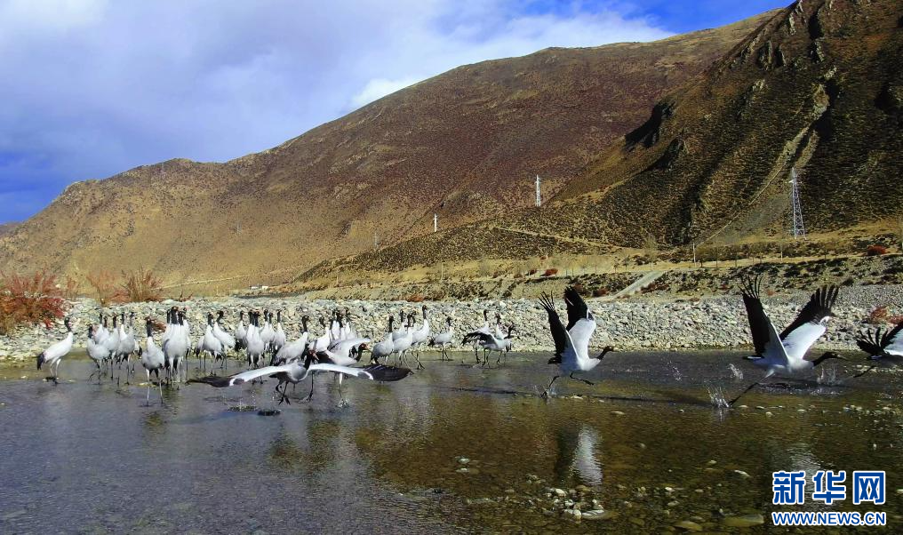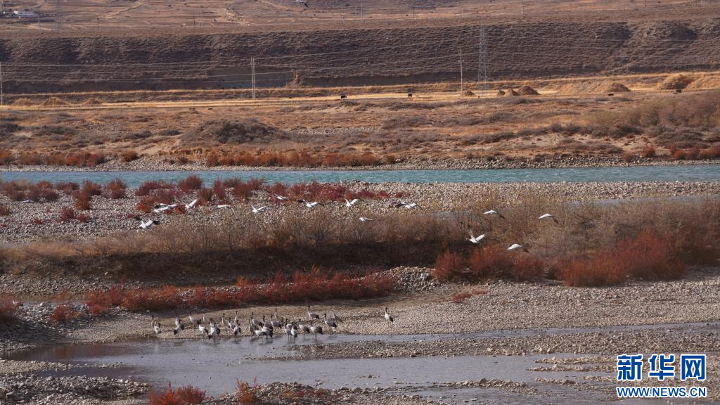 圖為岸邊的黑頸鶴(11月24日攝)。新華網(wǎng)發(fā) 嘎色攝