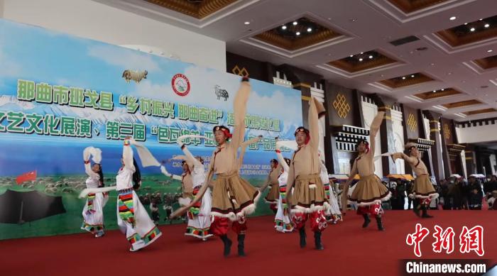 圖為班戈縣“鄉(xiāng)村振興 那曲奮進(jìn)”活動成果轉(zhuǎn)化暨文藝文化展演、第三屆畜產(chǎn)品展銷會開幕式歌舞演出。洛桑斯卓 攝