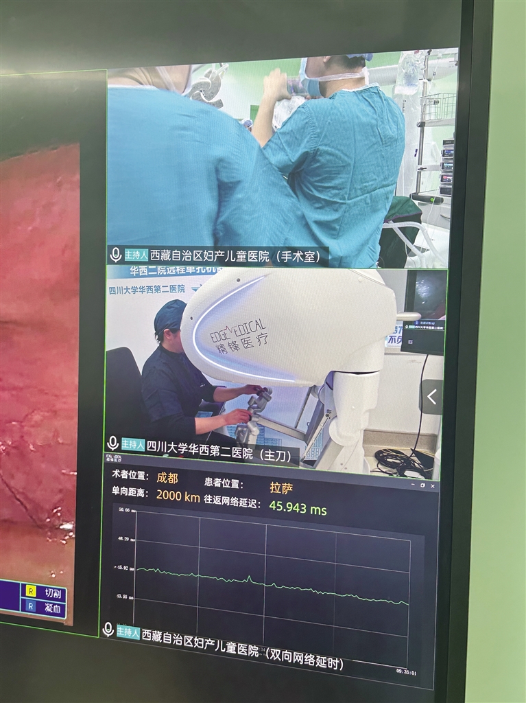 梅玲介紹,此次手術(shù)是與四川大學(xué)華西第二醫(yī)院聯(lián)合開(kāi)展的,由四川大學(xué)華西第二醫(yī)院的鄭瑩教授團(tuán)隊(duì)主刀,并依托華西的先進(jìn)技術(shù)平臺(tái),通過(guò)遠(yuǎn)程方式完成手術(shù)。手術(shù)結(jié)束后,鄭瑩教授通過(guò)視頻向大家介紹,這場(chǎng)跨越2000公里距離與3000米海拔差異的手術(shù),總共用時(shí)1小時(shí)45分鐘,網(wǎng)絡(luò)延遲僅40毫秒?!按舜问中g(shù)的成功為今后更多優(yōu)質(zhì)資源技術(shù)送達(dá)偏遠(yuǎn)地區(qū)提供了重要參考,也為提高西藏醫(yī)療水平打下了堅(jiān)實(shí)的基礎(chǔ)?!编崿撜f(shuō)。