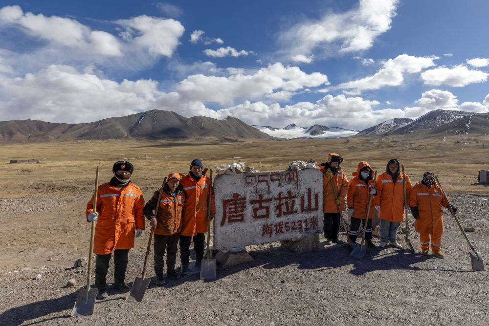 記者一行到達(dá)唐古拉山口時(shí),7名身穿橙色制服的養(yǎng)路工人,正在用鐵鍬修補(bǔ)路肩。盡管太陽(yáng)高懸,風(fēng)速卻不小,用來(lái)警示隔離的錐形交通路標(biāo)不斷被大風(fēng)吹倒,工人們不時(shí)要把它們扶正。
