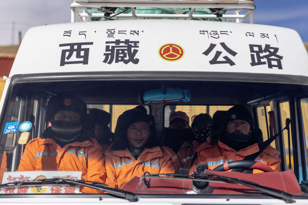 “天下第一道班”的養(yǎng)路工人們乘車(chē)去養(yǎng)護(hù)道路(12月1日攝)。新華社記者 姜帆 攝