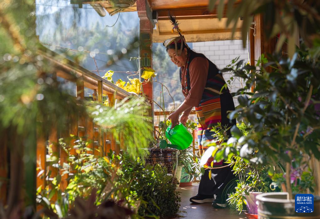 12月13日,陳塘鎮(zhèn)夏爾巴婦女次曲在自家民宿里澆花。
