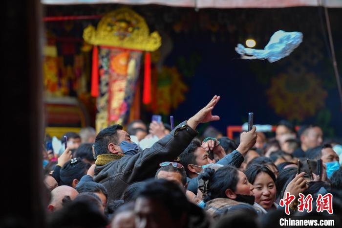 圖為12月15日,信眾在大昭寺拋獻(xiàn)哈達(dá),祈福。中新社記者 貢確 攝