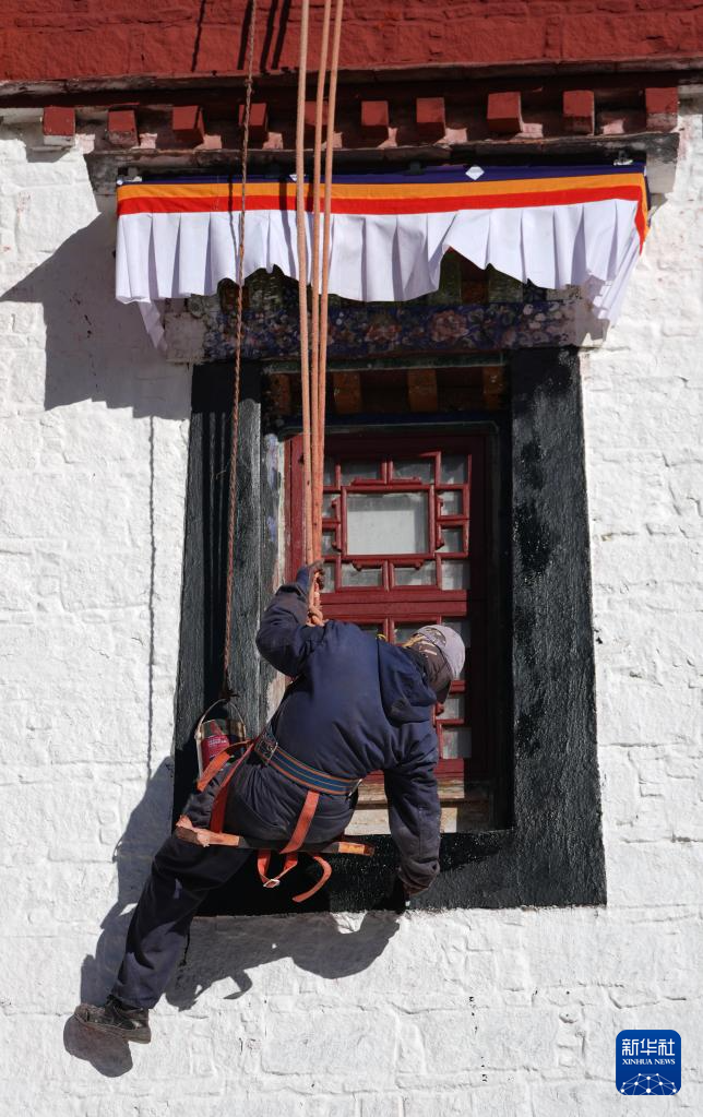 布達拉宮管理處維修科工作人員在粉刷墻體(12月4日攝)。新華社記者 晉美多吉 攝
