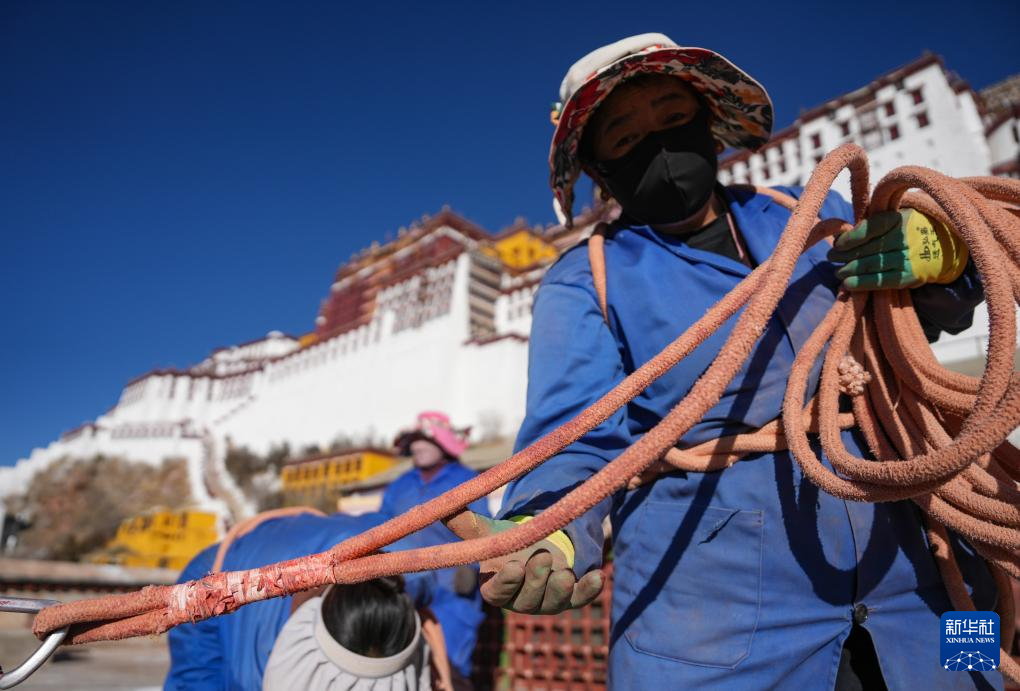 布達拉宮管理處維修科工作人員在整理安全繩,準備粉刷墻體(12月4日攝)。新華社記者 晉美多吉 攝