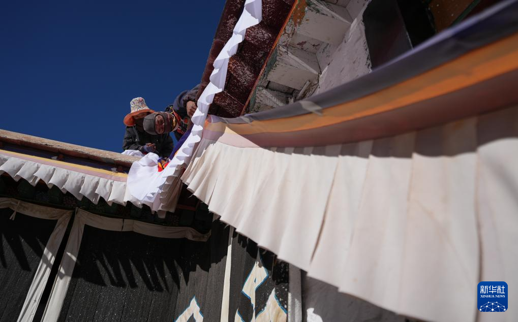 布達拉宮管理處維修科工作人員格桑央金(左)和朗杰在更換香布(12月4日攝)。新華社記者 晉美多吉 攝