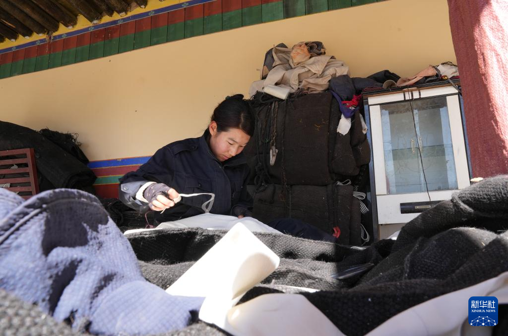 布達拉宮管理處維修科工作人員旦增卓瑪在縫制門簾(12月4日攝)。新華社記者 晉美多吉 攝