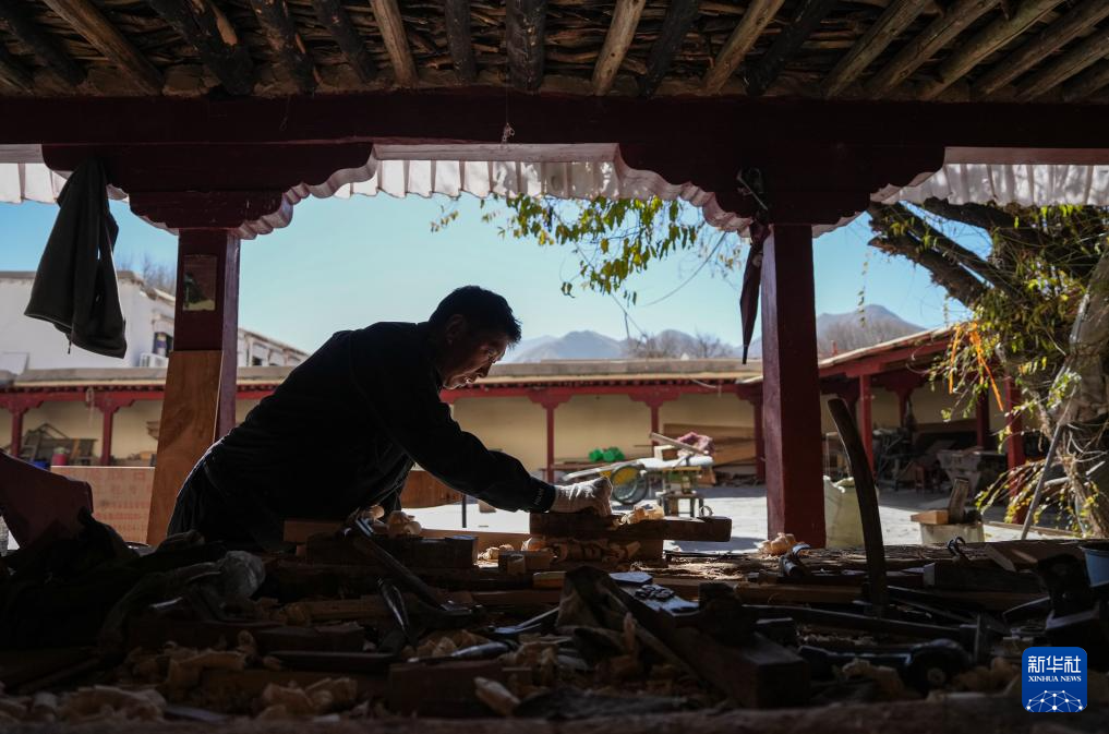 布達拉宮管理處維修科工作人員頓旦次仁在制作修繕所需的木構(gòu)件(12月4日攝)。新華社記者 晉美多吉 攝