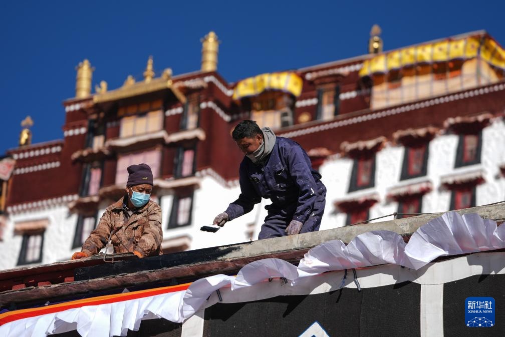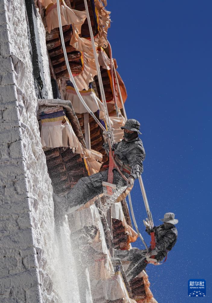 布達拉宮管理處維修科工作人員在噴灑涂料(10月30日攝)。新華社記者 晉美多吉 攝