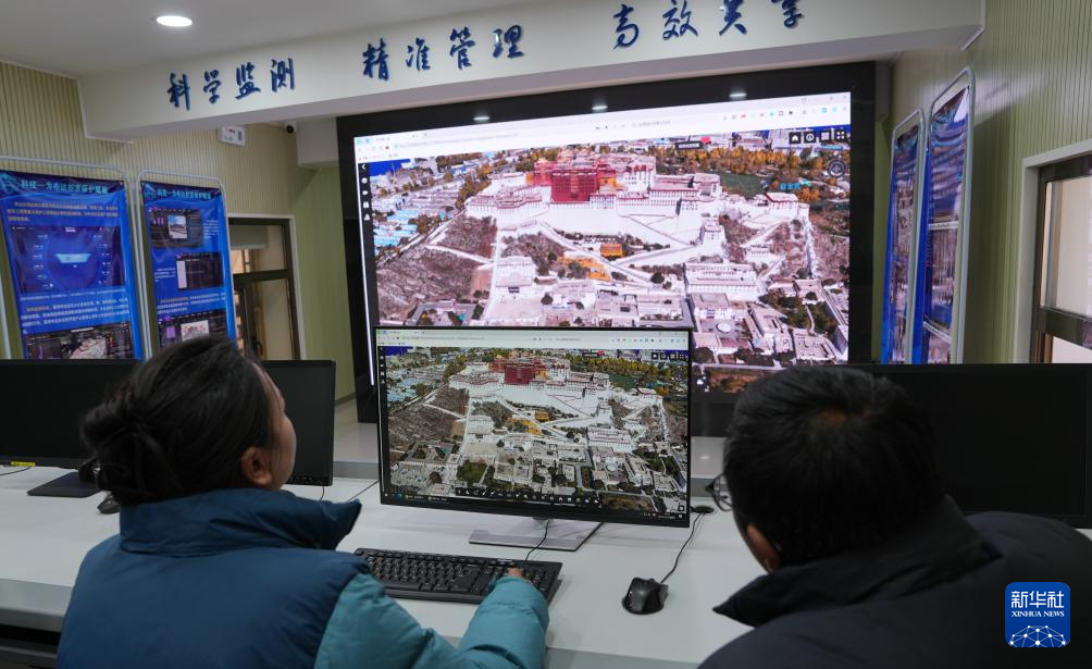 12月4日,布達(dá)拉宮監(jiān)測中心的工作人員在查看無人機拍攝的圖像。新華社記者 晉美多吉 攝