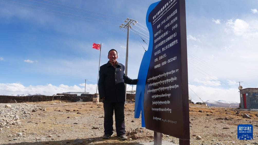 多杰才覺站在麥地卡濕地入園須知牌旁,背后是他升起的國旗。新華社記者 魏冠宇 攝