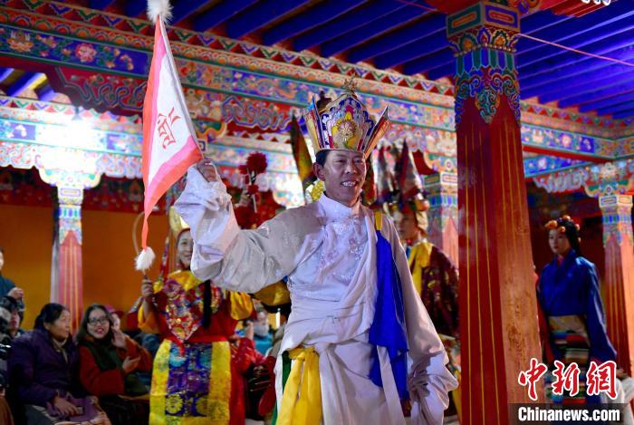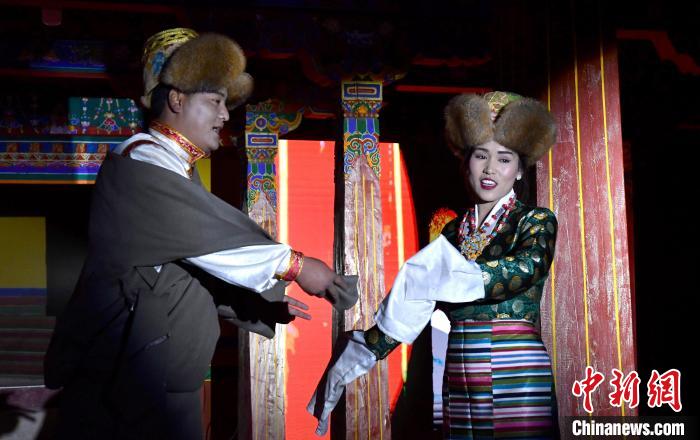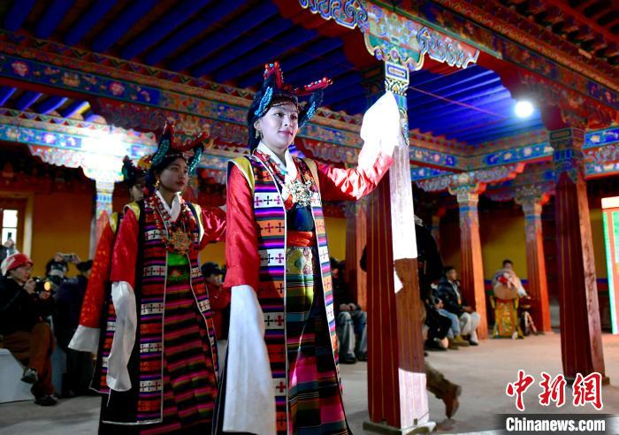 1月2日晚,一場(chǎng)視聽結(jié)合、感官沉浸的拉薩傳統(tǒng)演藝服飾秀在西藏自治區(qū)拉薩市喜德林古建大院上演。囊瑪堆諧、覺木隆藏戲等非遺的演繹,讓觀眾領(lǐng)略到拉薩深厚的文化底蘊(yùn)。圖為拉薩傳統(tǒng)演藝服飾秀演出現(xiàn)場(chǎng)。中新社記者 李林 攝