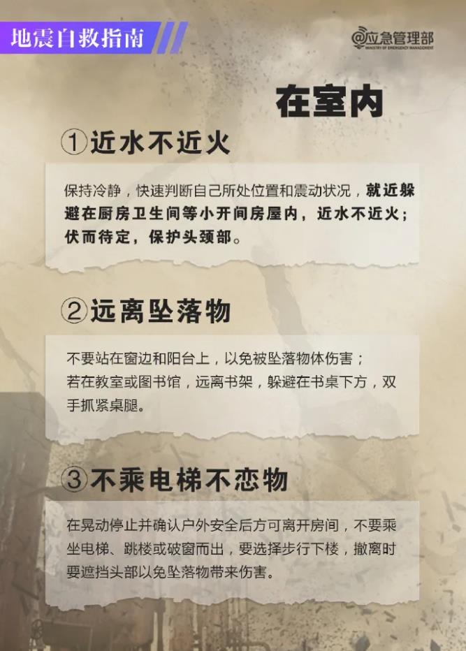 我們要遠(yuǎn)離主墻面、門(mén)窗和有高大家具的地方,迅速到衛(wèi)生間、廚房等小開(kāi)間房間躲避,等晃動(dòng)停止后,再沿消防通道有序疏散,以防后續(xù)余震的影響。疏散時(shí)禁止乘坐電梯,也不提倡在有地震的時(shí)候,利用繩索逃生。