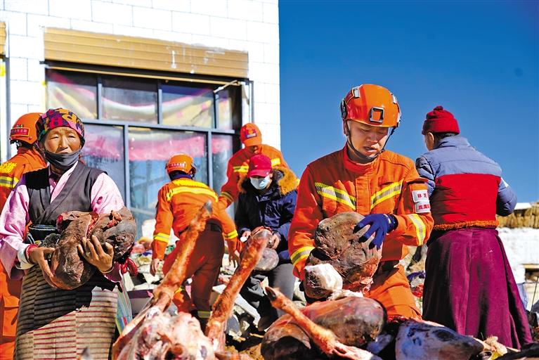 1月8日,在定日縣措果鄉(xiāng)美朵村,林芝市森林消防支隊消防員在協(xié)助受災(zāi)群眾轉(zhuǎn)移冬季存放的羊肉。記者 索朗群培 攝