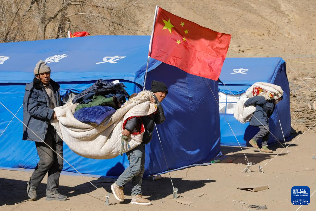 1月10日,在定日縣長所鄉(xiāng)古榮村,受災(zāi)群眾將過冬物資從臨時安置帳篷搬入板房。新華社記者 沈伯韓 攝