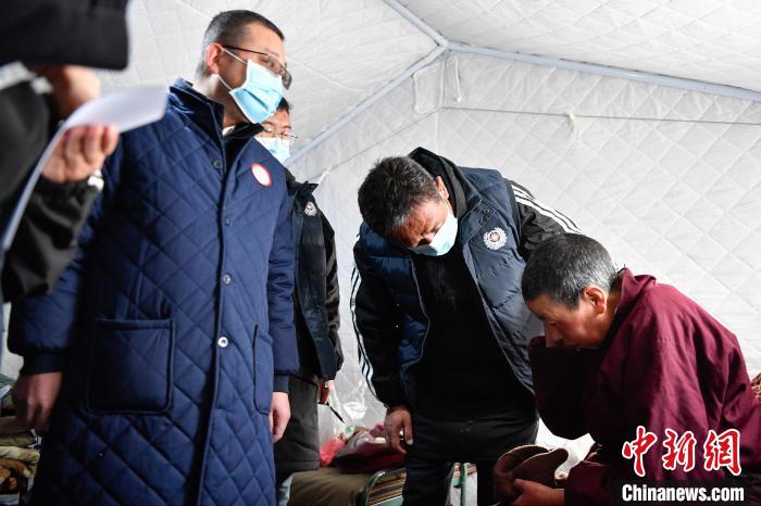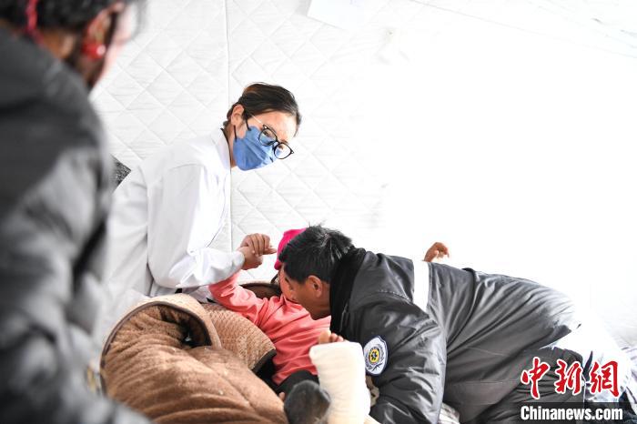 1月10日,西藏定日,醫(yī)護人員帶老人達娃的孫女去復(fù)查?!≈行律缬浾?貢嘎來松 攝
