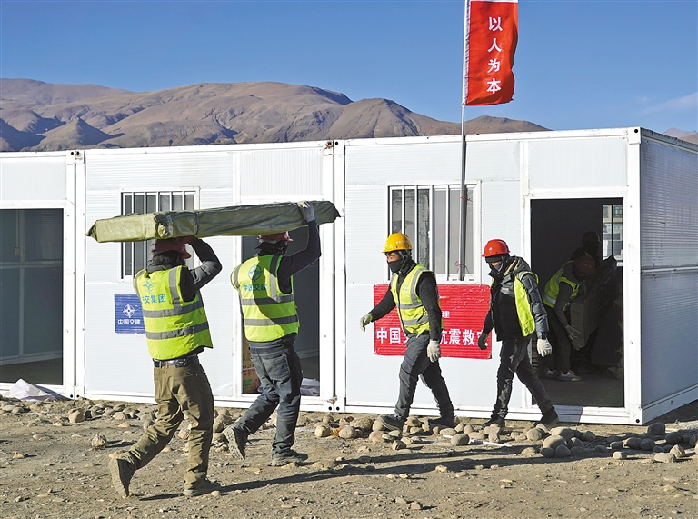 圖為1月10日,中交集團(tuán)二航局二公司工作人員在拉孜縣為受災(zāi)群眾組裝活動(dòng)板房。記者 薛瑩 王香香 索朗群培 攝